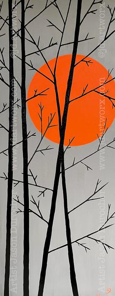 This new, original painting captures the essence of October. Thin birch trees silhouetted against a rich, deep sunset as daylight gets increasingly short. You can smell the leaves on the ground, and smoke in the cool air. Something mysterious waits to invite you into the magic of night.